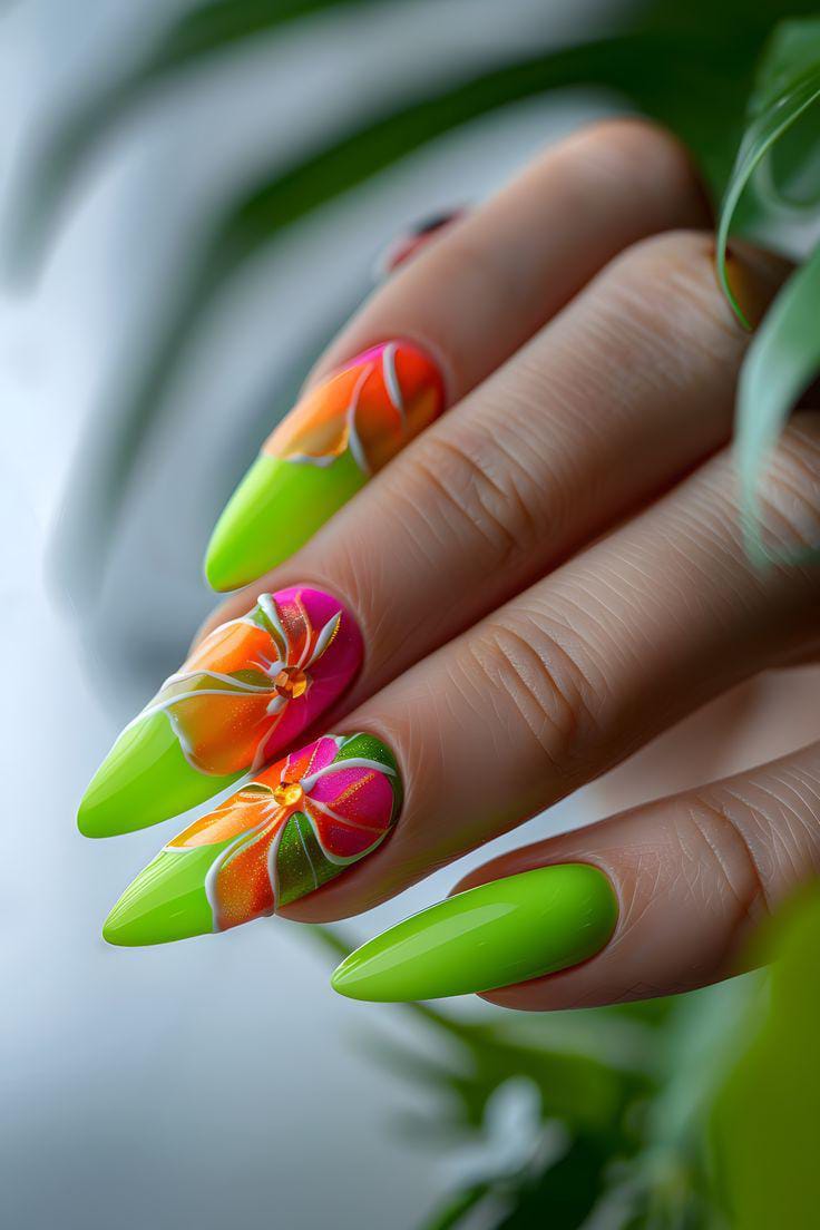 Bold neon green nails are paired with colorful tropical flower art in pink and orange for a striking summer statement. The glossy finish and high-contrast colors give this design a fun, bold vibe.