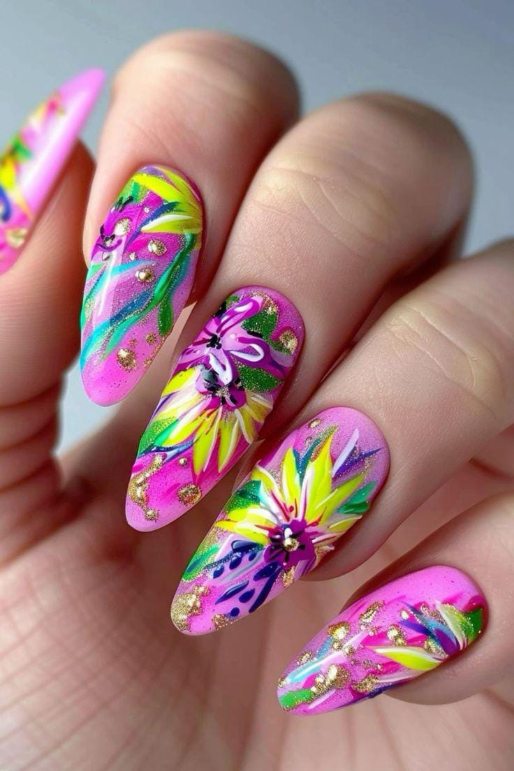 This design combines light pink base with hot pink, yellow, green, and glitter details with expressive floral art. The overall feel is artistic, bold, and full of summer energy, ideal for making a statement.
