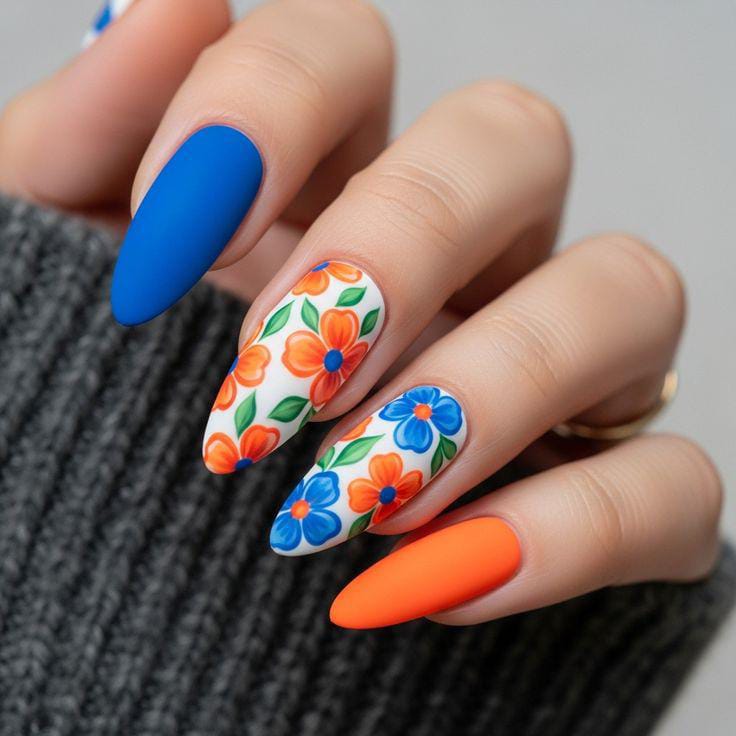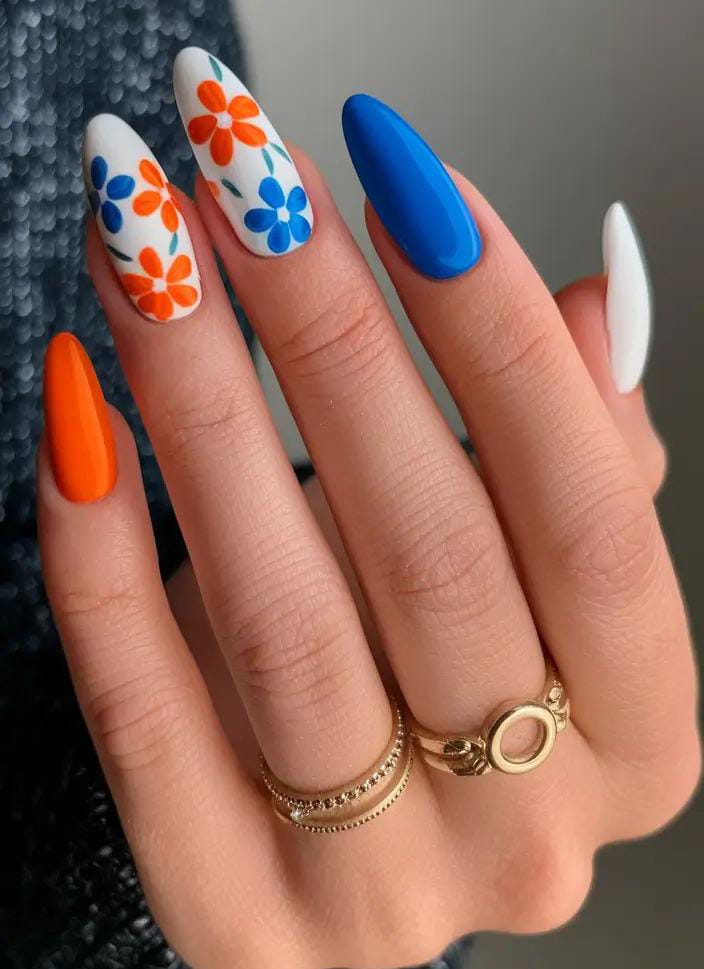 Bright blue, vivid orange and white come together with bold, retro-style flowers for a fun, statement-making manicure. The crisp contrast and clean patterns give it a cheerful, throwback summer feel that instantly stands out.