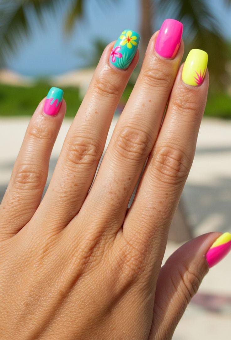 This design features vibrant neon shades like hot pink, sunny yellow, and turquoise with floral and leaves for a true beach-ready look. The mix of solid colors and tropical-inspired accents creates a carefree, summer vacation-worthy vibe.