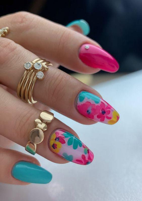 These pink and blue nails with a mix of teal, pink, and yellow paired with hand-painted floral details on milky base single bold gemstone gives this design a playful yet polished feel. The bold color blocking keeps it modern while the flowers add a soft, artistic summer touch.