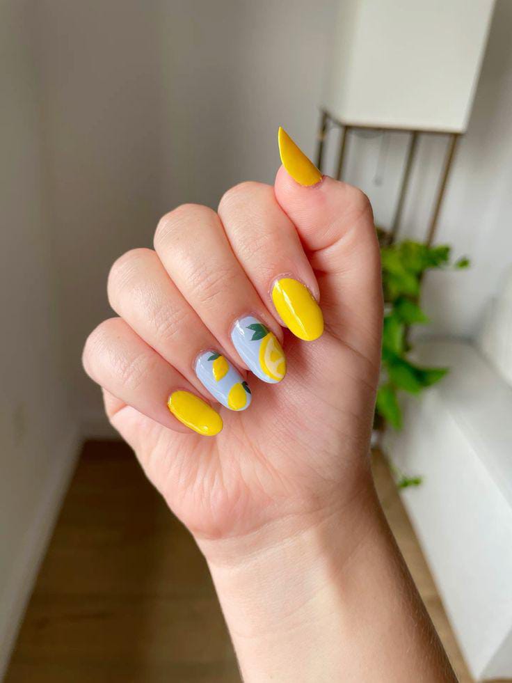 Bright yellow and light blue nails paired with soft lemon artwork give this design a fresh, breezy summer feel. The look is clean and minimal, with just enough detail to keep it playful and bold.