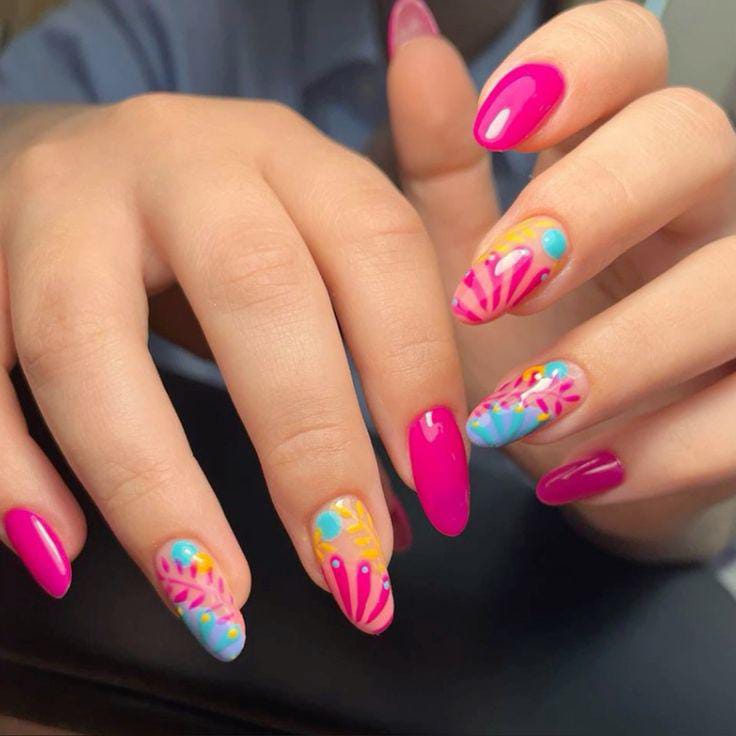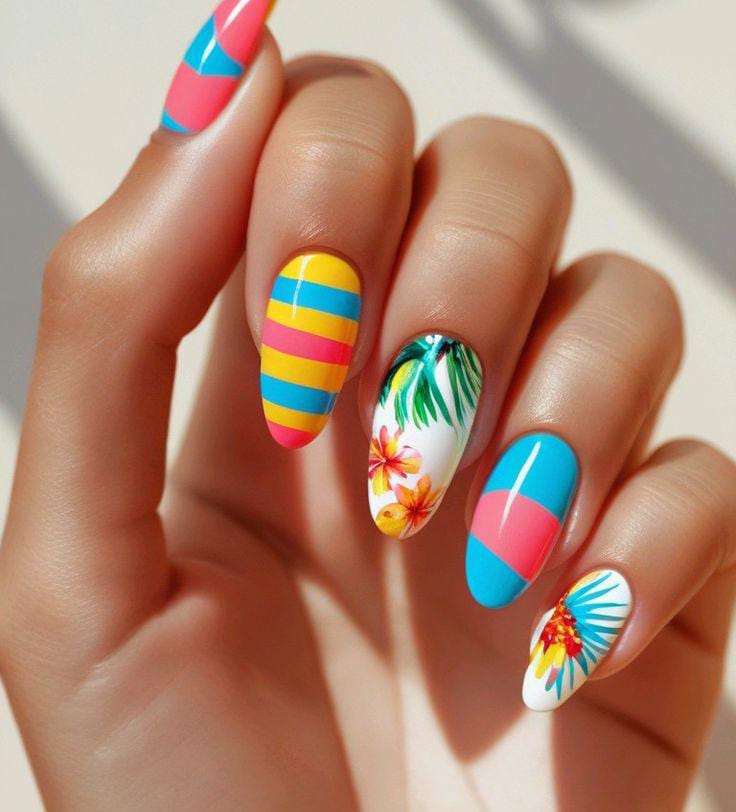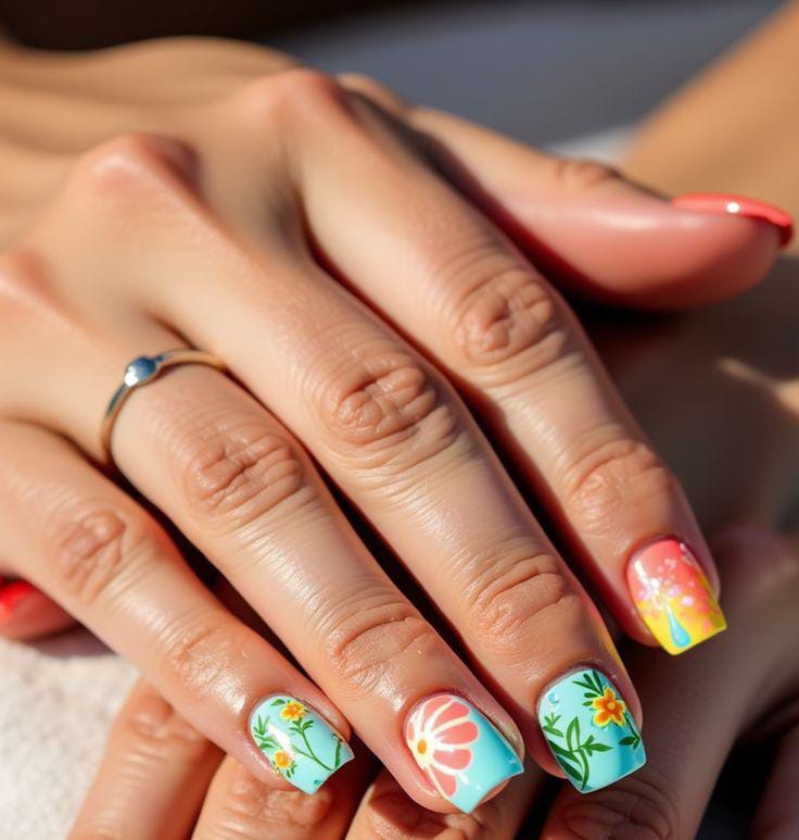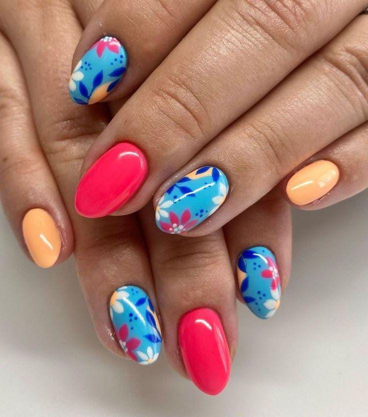 This design mixes bright pink, peach, and sky blue with playful floral, dots accent nails. The bold colors and glossy finish give it a fun, vacation-ready summer vibe that feels fresh and cheerful.