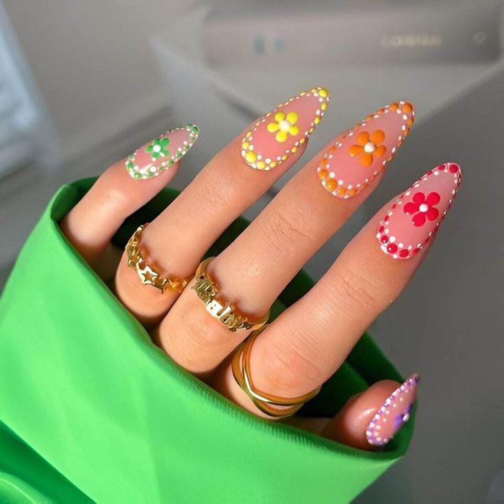 This design features a sheer nude base topped with bright, colorful daisy flowers and dotted frame accents. The mix of neon tones gives it a playful, cheerful bold summer vibe that feels fresh and eye-catching.