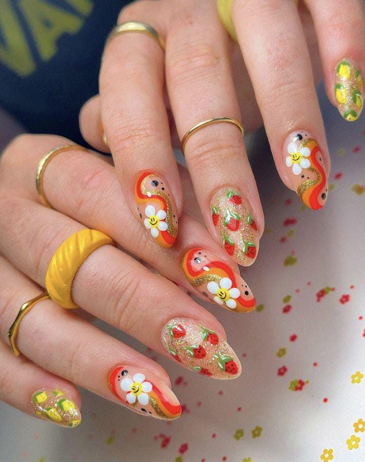 This look combines warm orange glitter and red swirls with cute smiley face floral and strawberry, lemon details on a soft nude base. The glitter nails add a fun sparkle, giving it a bold, happy summer aesthetic.