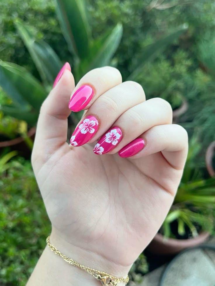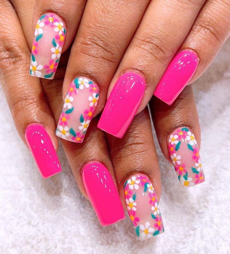 This design keeps things playful with a bright pink base and simple white floral accent nails. It feels fun, feminine, and perfect for sunny summer days when you want something bold but still clean and polished.