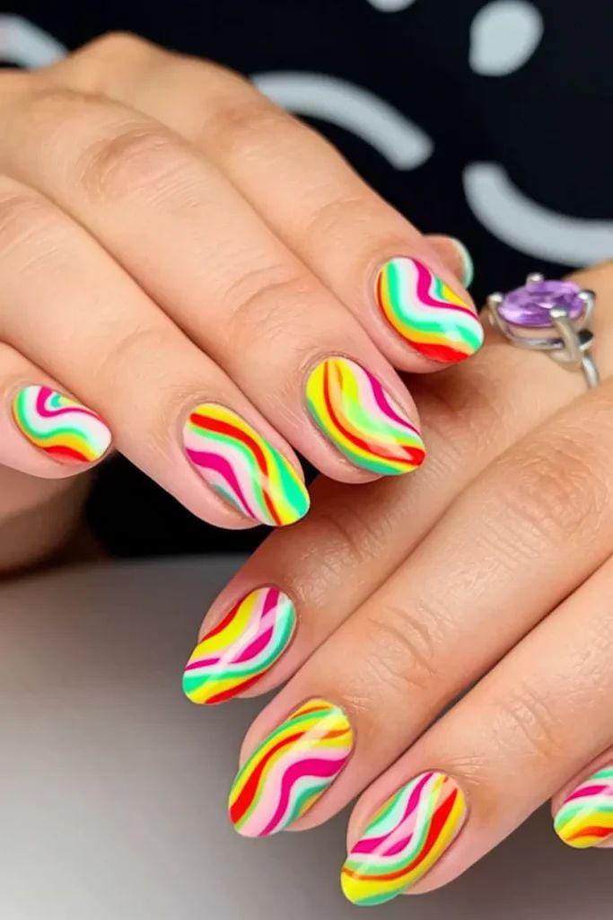 These nails showcase flowing, wavy lines in vibrant rainbow colors over a soft base. The design feels retro-inspired and bold, with a smooth, eye-catching movement that screams fun summer energy.