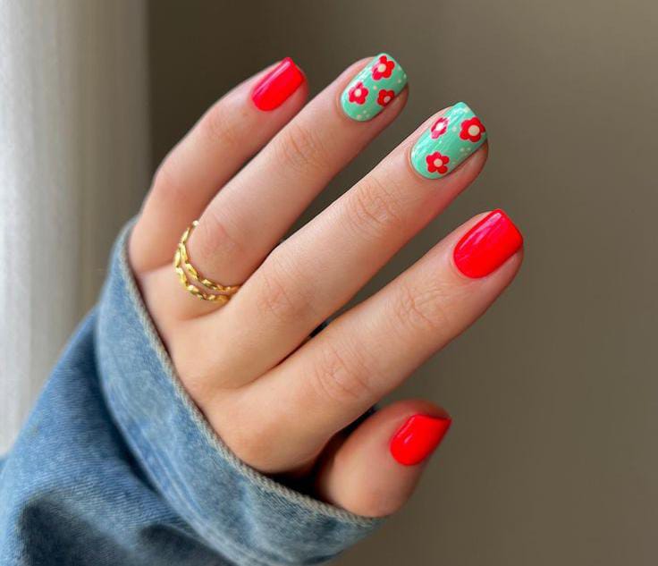 These nails combine solid, bright red polish with cute floral accents on a soft green base. The overall look is bold yet balanced, giving off a fresh, playful summer feel with a touch of boldness.