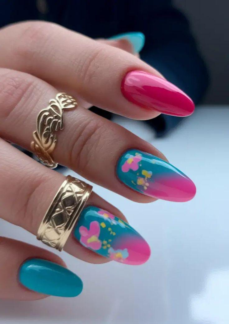 These vibrant pink and blue nails combine a soft ombre fade with delicate floral details in bright summer shades. The look is bold yet smooth, giving off a dreamy sunset-inspired summer mood.