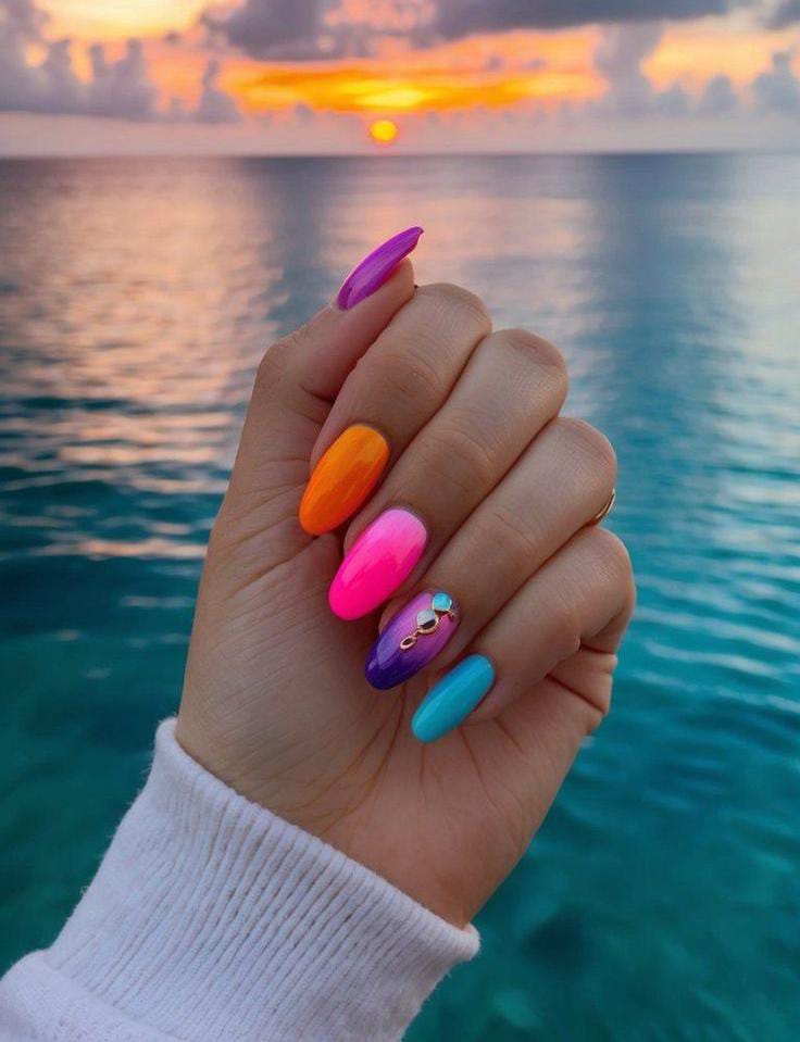 Vivid neon shades like pink, orange, purple ombre, and blue pop against a serene ocean backdrop, delicate subtle bold gemstones. The look is bold and carefree, blending beachy calm with high-impact summer color.