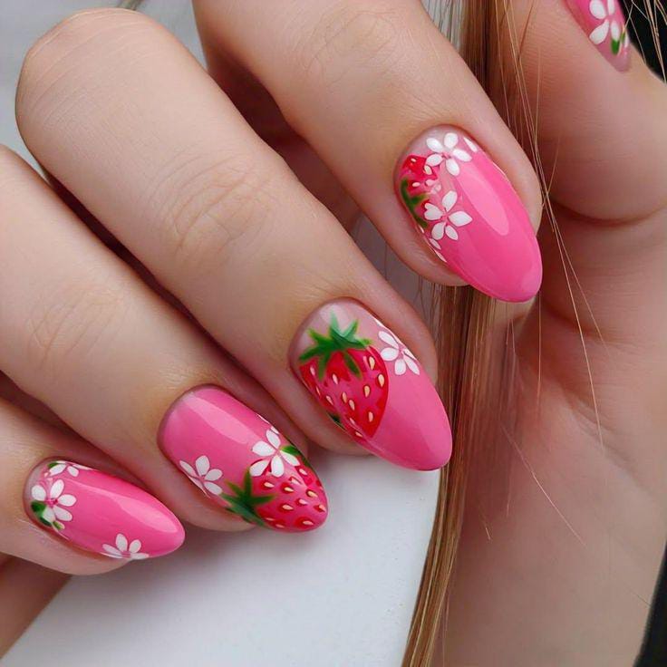 Glossy pink nails are paired with strawberry motifs and tiny white flowers for a sweet yet vibrant finish. The design feels playful and summery, balancing bold color with soft, cute details.