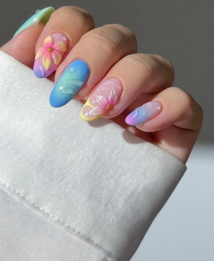 Soft pastel shades blend together with raised floral details for a dreamy, almost fairy-like look. The mix of gentle colors and 3D-style flowers and gold studs gives these nails a light, whimsical bold summer feel.