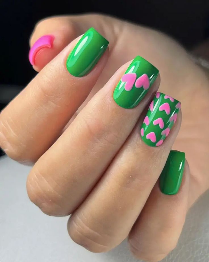 This design features a gradient of soft pastel shades with cute heart details at the tips of the nails, giving it a fun and romantic vibe. It’s playful yet delicate with a youthful charm.