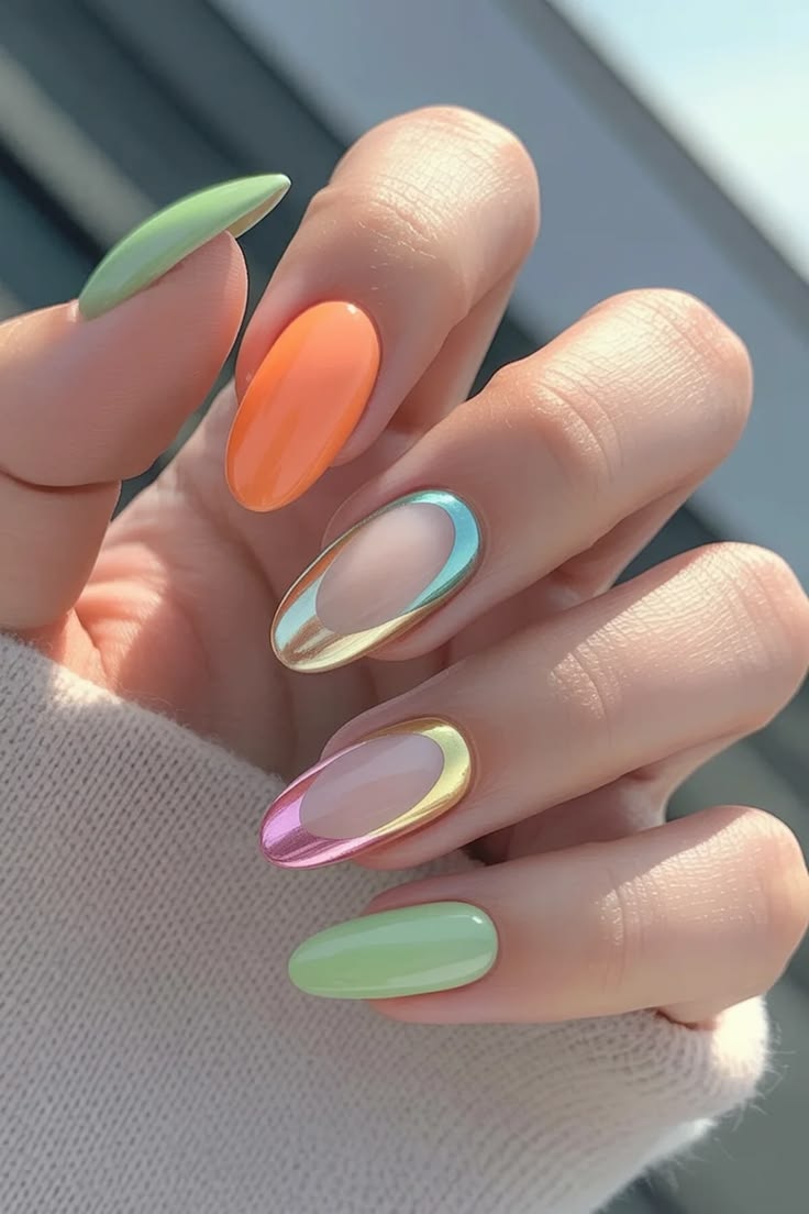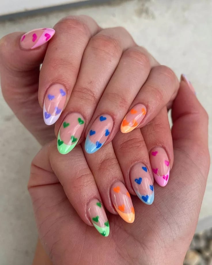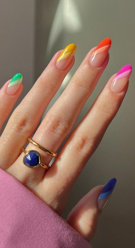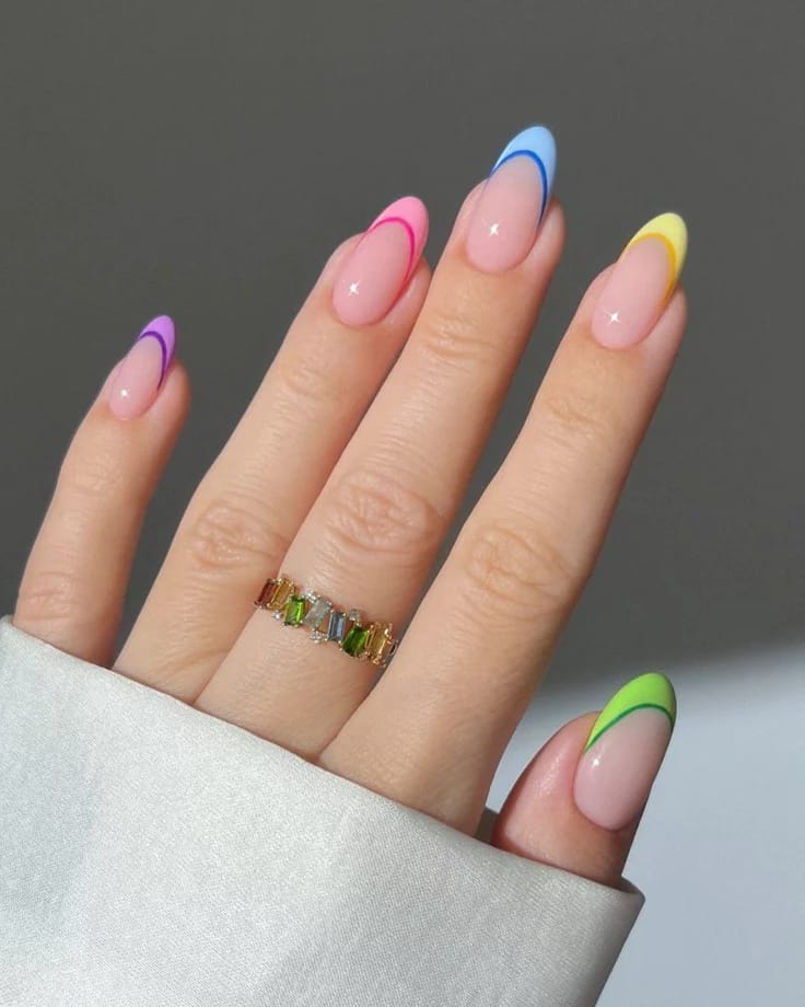 These almond-shaped nails feature a soft nude base with bright rainbow-colored swirls on each tip, creating a playful and artistic look. The mix of yellow, orange, pink, green, and blue gives the design a cheerful summer vibe.