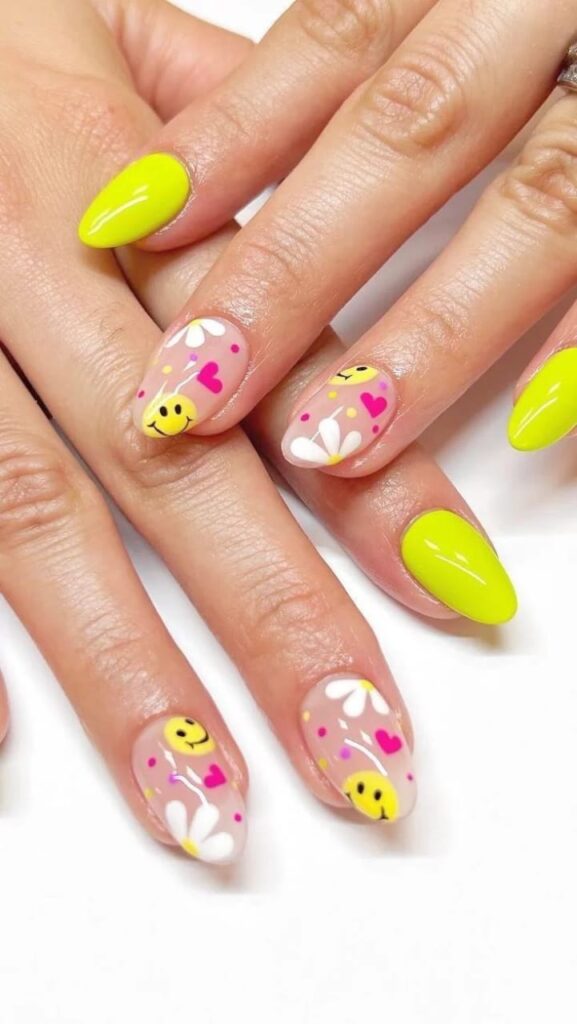 A bright, cheerful look with smiley faces and heart designs on a soft pink base with solid bright yellow accent nails. It captures a fun and positive vibe, perfect for the summer