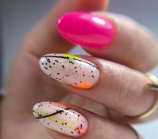 A bright combination of neon pink, yellow, and blue creates a lively and dynamic nail design. The dotted accents and contrasting colors deliver an energetic and eye-catching look.