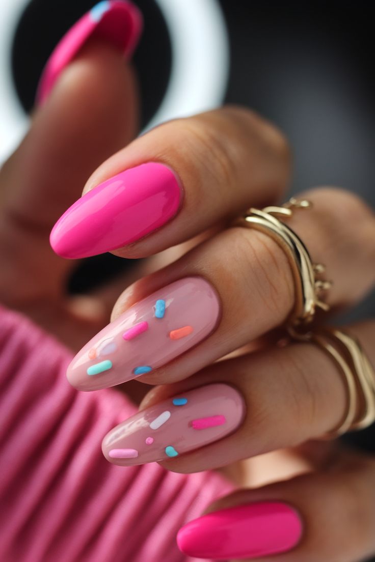 A soft pink base adorned with colorful sprinkles for a sweet and playful look. The bright pink and pastel sprinkles give it a fun, youthful vibe.