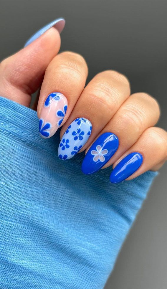 Soft blue shades and delicate flower patterns create a calm and whimsical vibe. The combination of solid blue nails with floral accents adds a refreshing touch to the classic nail design.