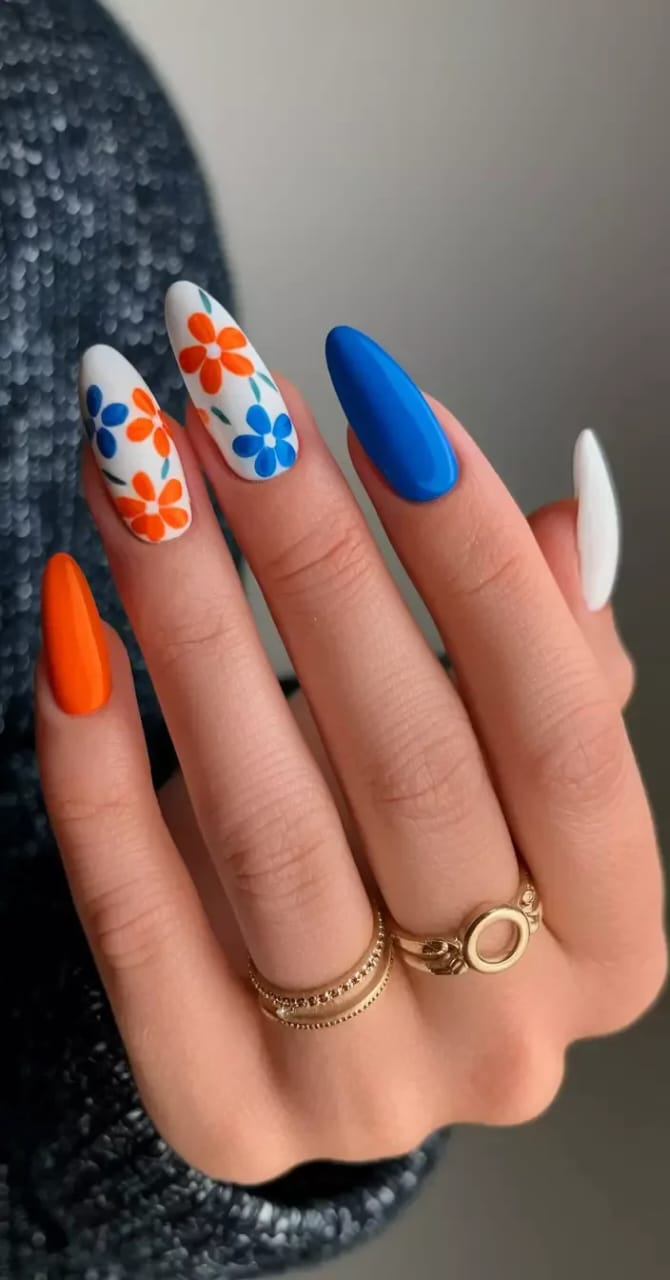 Bold and lively orange and blue tones bring a playful twist to this floral design. The contrast between the bright colors and the intricate flower patterns on white nail creates a youthful and energetic look.