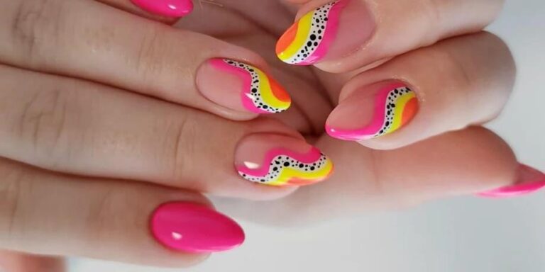 This design showcases a combination of pink, yellow, and orange waves at the tips, framed with black dots for a stylish and bold contrast. The playful waves bring a fresh, summer-ready vibe.