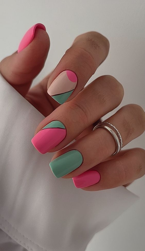 A modern and chic design with soft pastel colors, combining pink, peach, and mint green in a geometric pattern. This stylish, abstract design feels fresh and trendy, perfect for the summer.