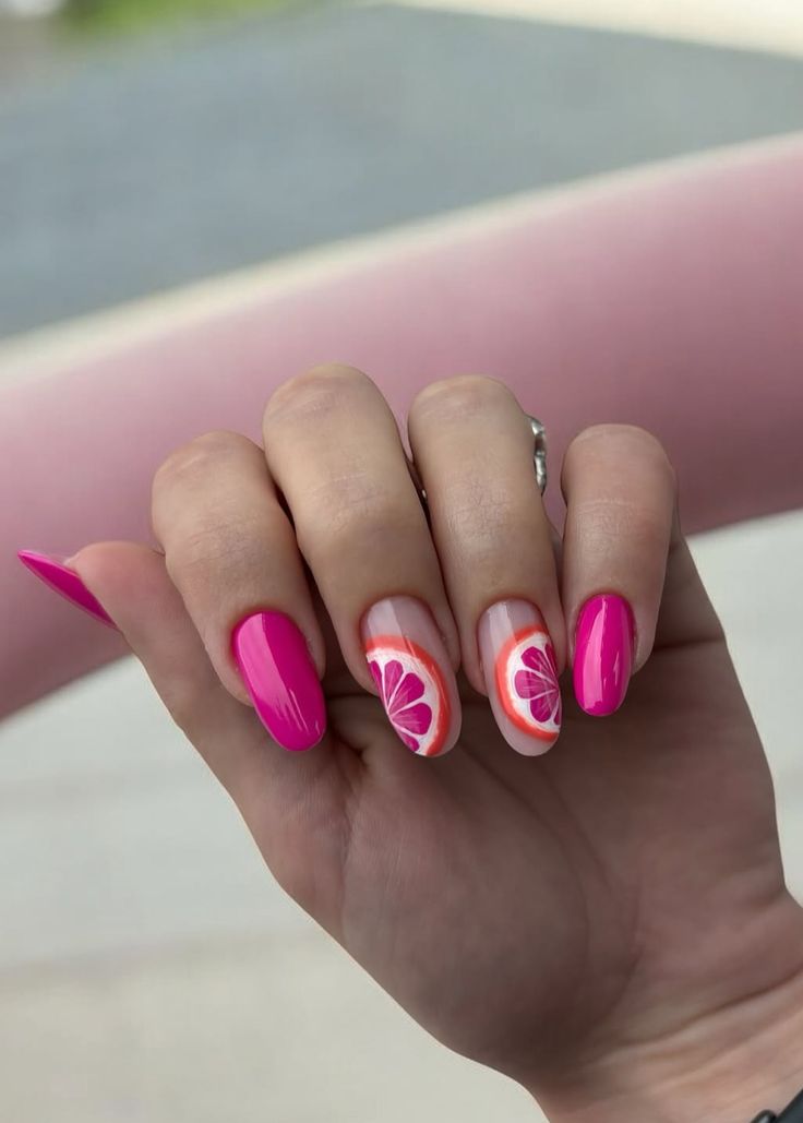 Bright pink nails with a citrus-inspired accent create a fresh and summery design. The lemon-like design on the accent nails adds a touch of fruity fun to this vibrant and trendy look.