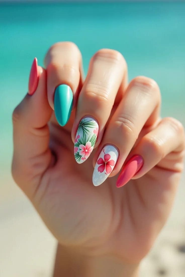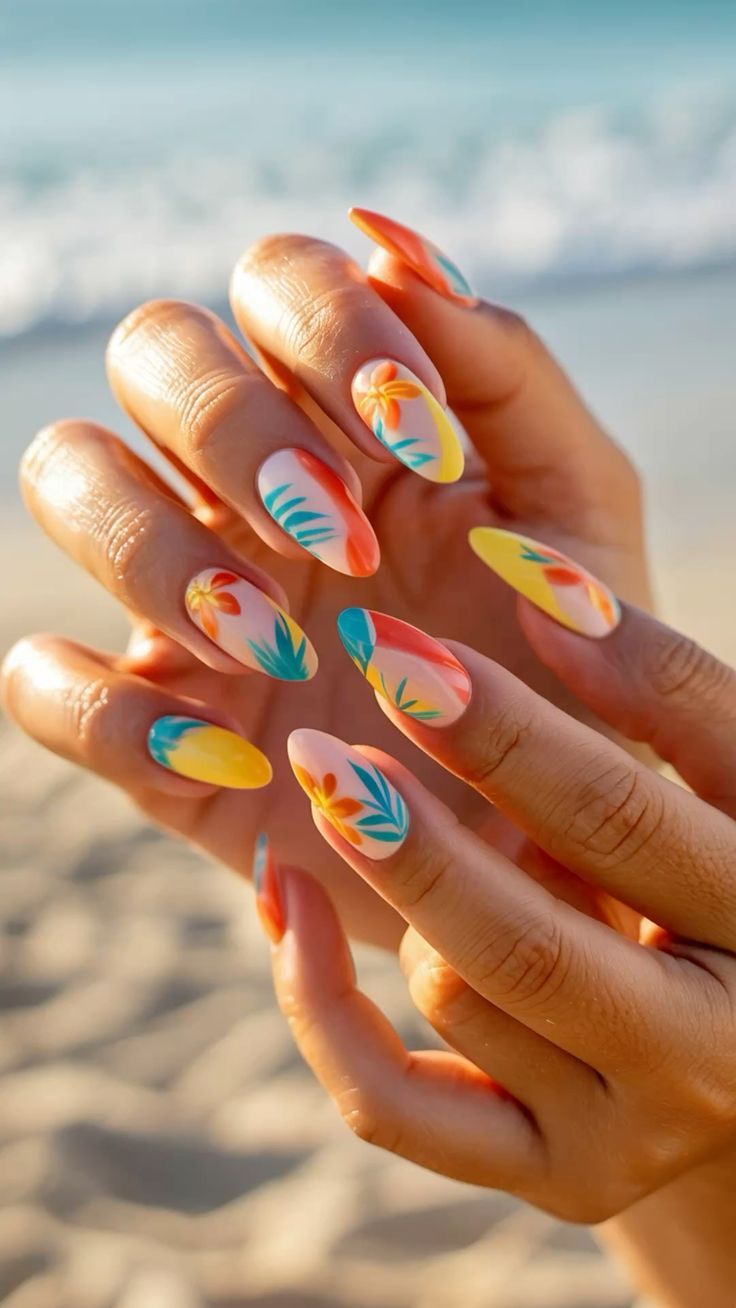 These nails showcase warm summer shades like coral, yellow, and teal with delicate tropical leaves and floral accents. The colorful mix and beachy theme create a fresh, vacation-inspired summer style.