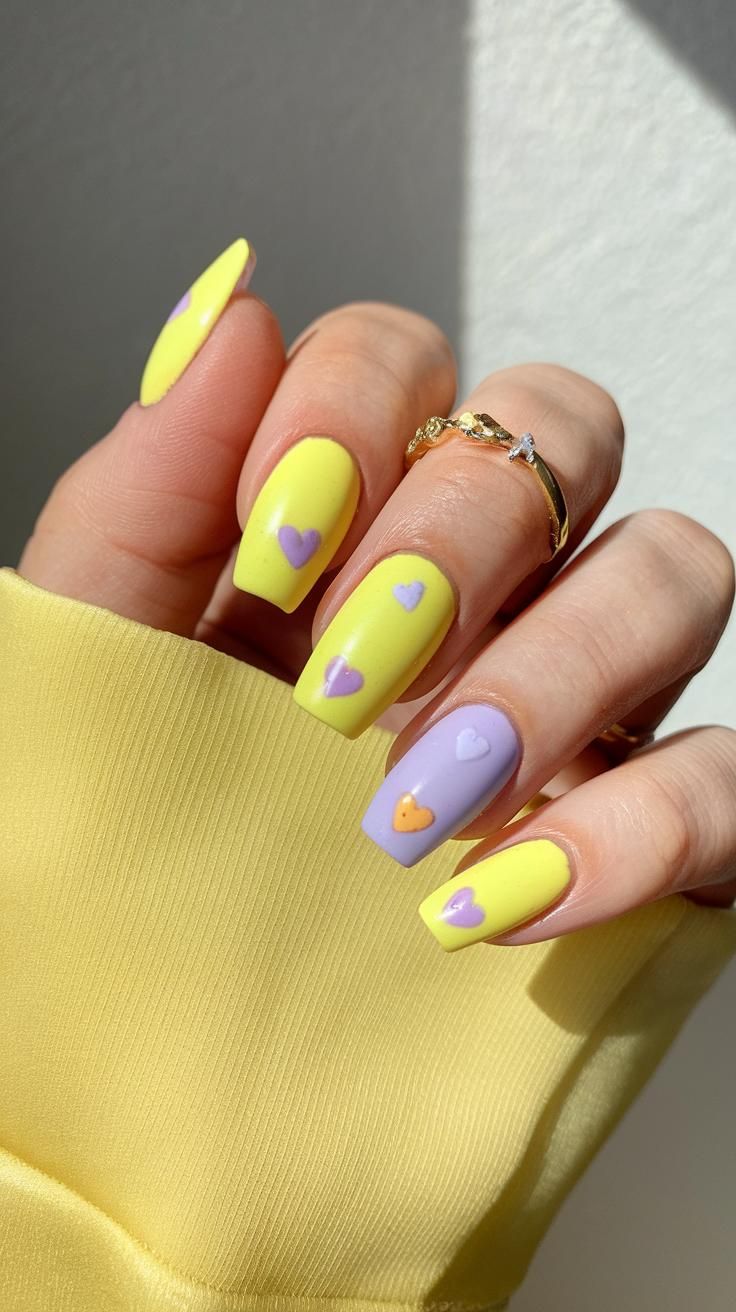 Soft pastel yellow and lavender nails adorned with cute, colorful heart accents, offering a sweet and playful vibe perfect for the season.