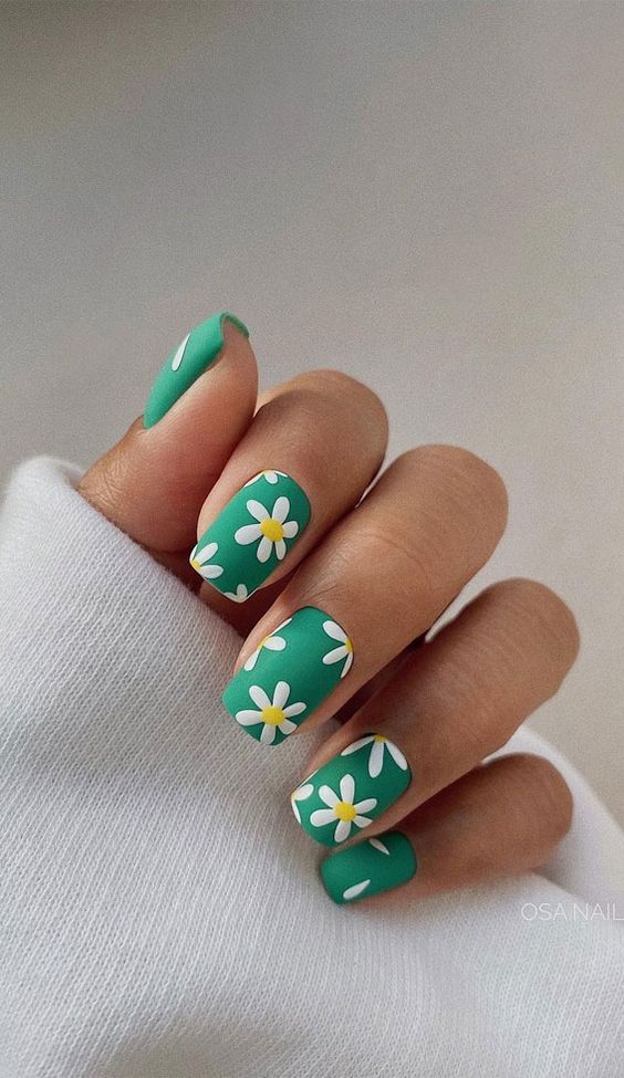 A refreshing green matte base with cute daisy flower designs, giving off a breezy, nature-inspired, and easygoing vibe ideal for summer.