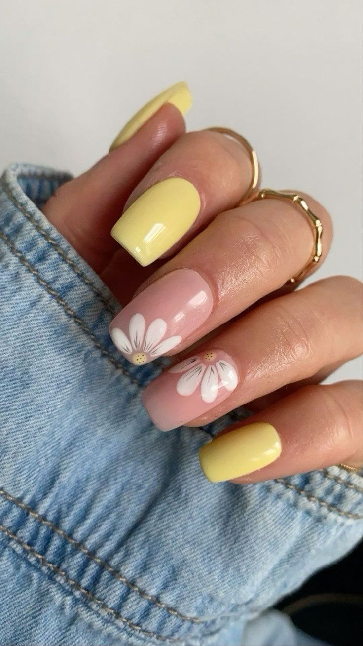 Soft yellow nails paired with light pink and white daisies provide a simple yet charming design. It embodies a light, fresh, and cheerful summer mood, making it perfect for a playful, nature-inspired style.