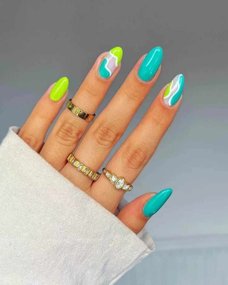 This design features a playful, wavy pattern with bold teal and neon green colors, highlighted with white accents. The combination of bright colors and fluid lines creates a fresh, modern aesthetic.
