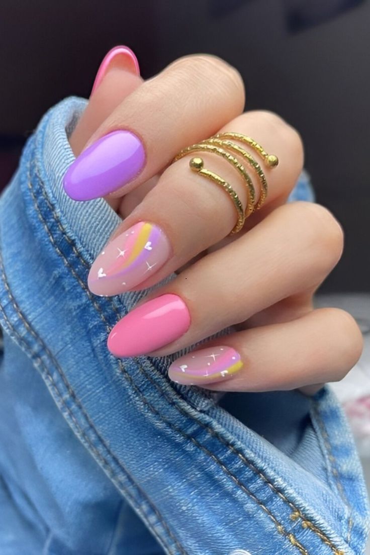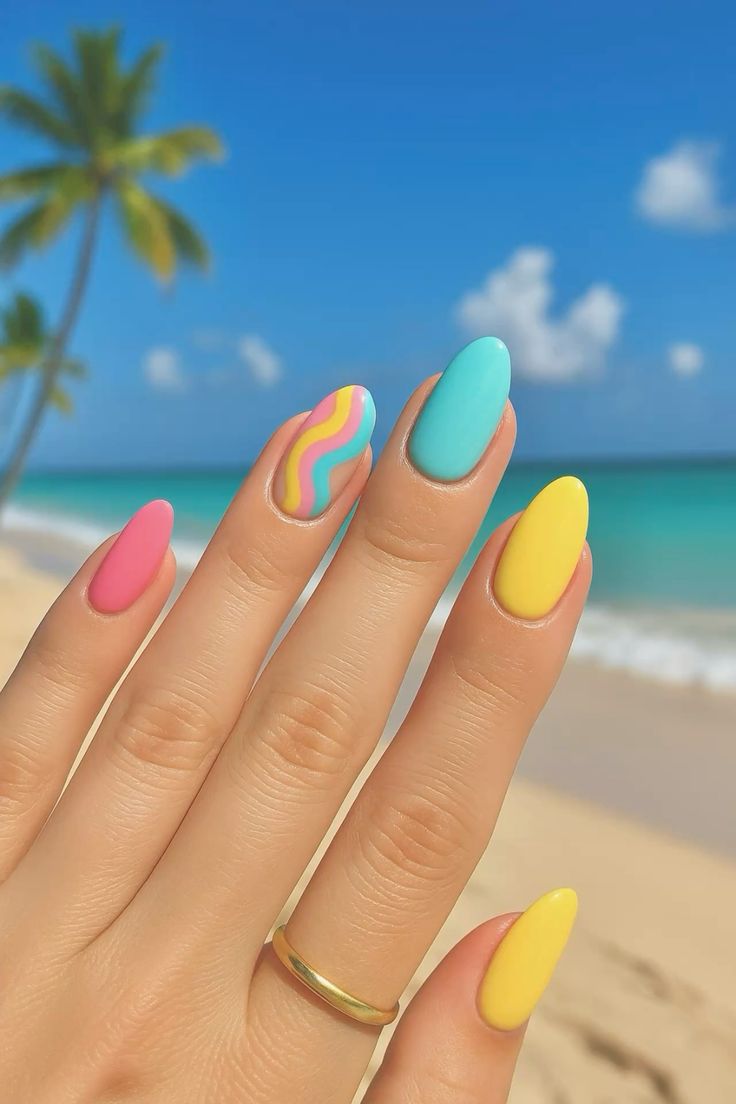Soft pastel blue, pink, and yellow nails with a rainbow stripe give off a relaxed, beachy vibe. This design captures the essence of summer by the sea.