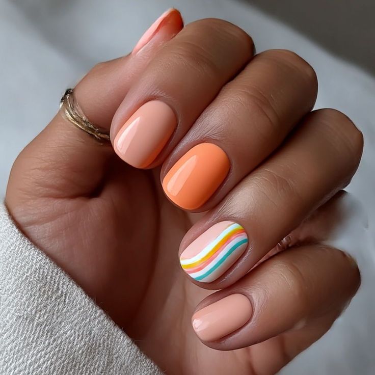 Soft peach and nude nails create a fresh, minimal summer look. One accent nail features playful rainbow waves that add a bright and cheerful touch.