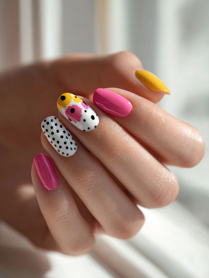 This design mixes bold pink and yellow nails with fun black polka dots. The accent nail has colorful abstract shapes, giving the manicure a playful and artsy summer vibe. 🌼✨