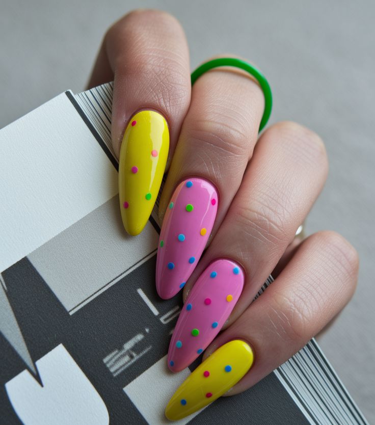 Bright yellow and pink nails are paired with playful multicolored polka dots, creating a fun and cheerful summer vibe. The glossy finish and bold colors make the design feel lively and youthful.