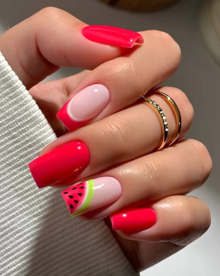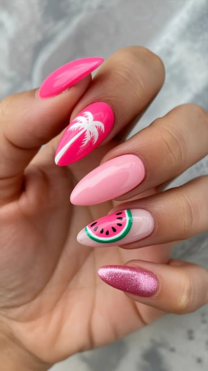 This design features vibrant pink shades with cute tropical accents like a palm tree and a watermelon slice. The mix of glossy and shimmery finishes gives the nails a fresh, summery feel.