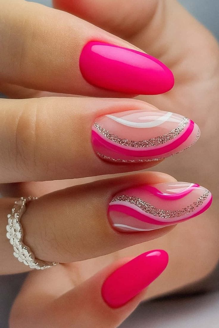 This design combines vibrant hot pink nails with accent nails featuring soft nude bases and flowing pink and white waves. A thin line of silver glitter adds sparkle and makes the look feel glamorous yet fun.