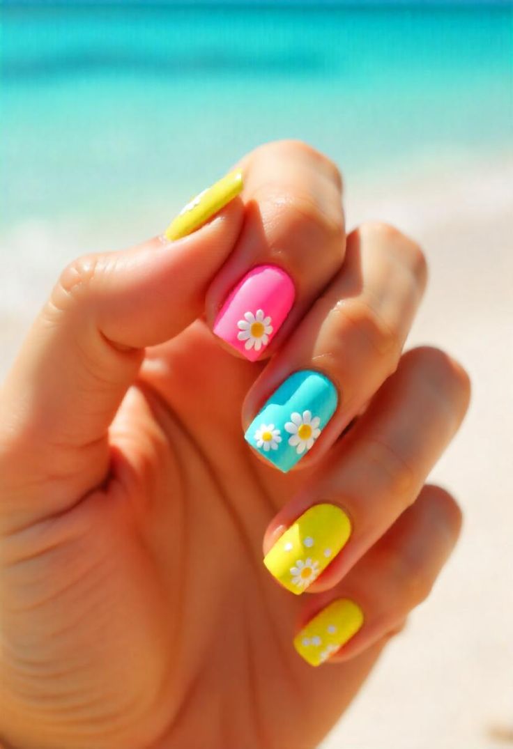 Bright, pastel hues of pink, blue, and yellow paired with adorable daisy flowers create a playful, beachy vibe. Perfect for summer fun, this design adds a cheerful, colorful touch to your nails.