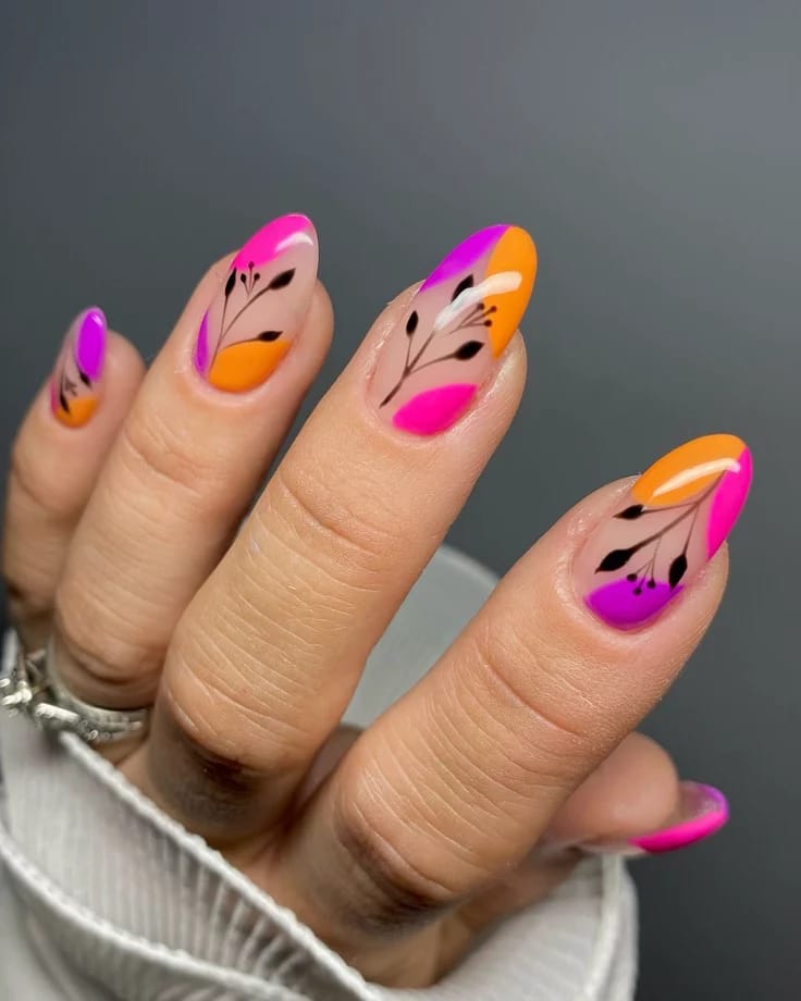 A stunning, bold mix of pink, purple, and orange tones with delicate black floral accents. The gradient effect and intricate floral details give this design an artistic and trendy summer vibe.