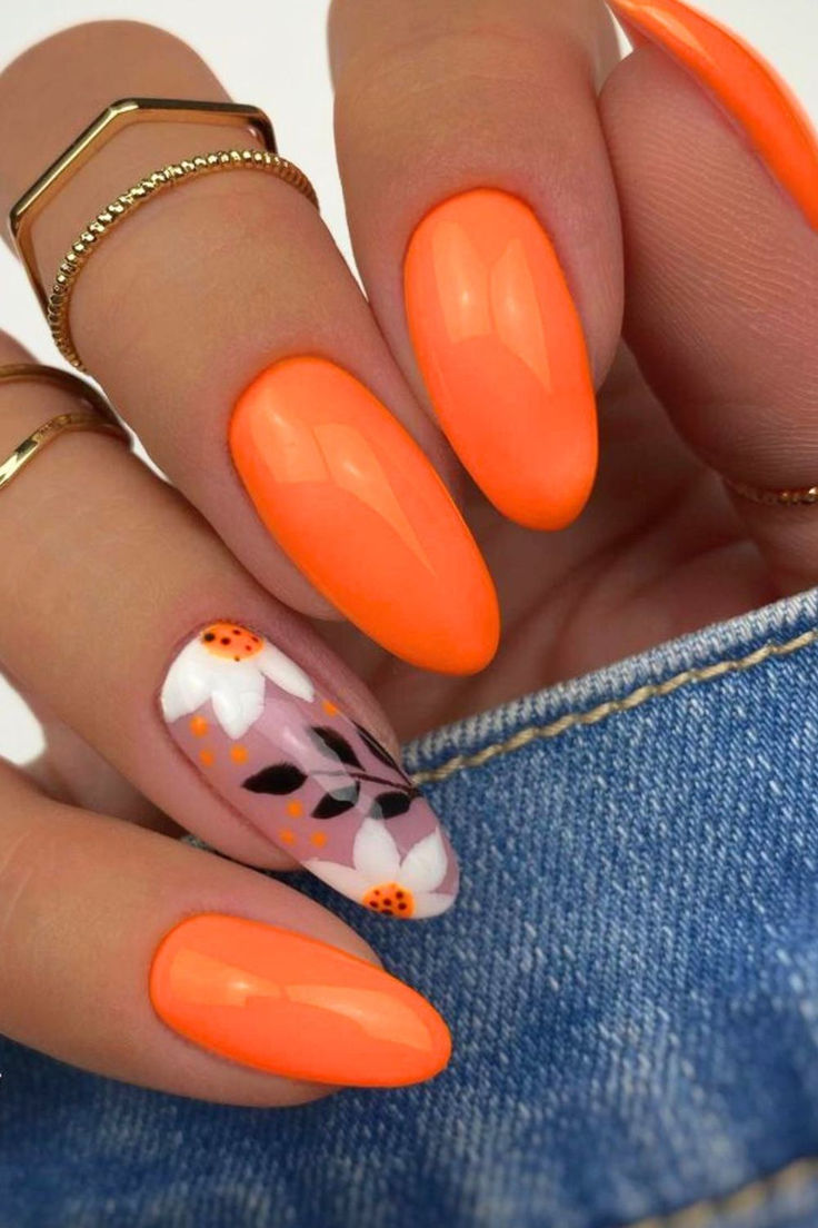 Bold neon orange nails with a subtle floral design on the accent nail give off a fresh, vibrant summer look. The delicate flowers in soft tones contrast nicely with the bright base color, creating a chic, summery feel.
