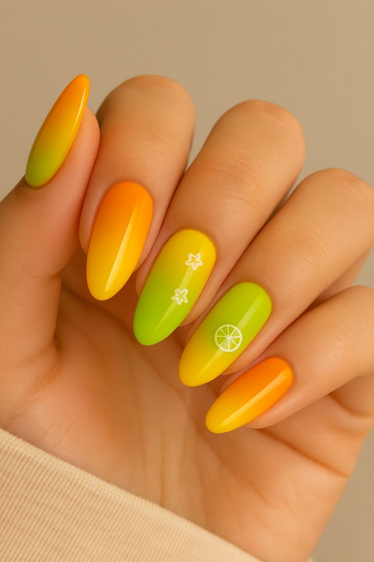 This design features a vibrant gradient from orange to yellow, accented with a cute lime slice and small floral details. The colors and playful patterns evoke a fun, summery vibe.