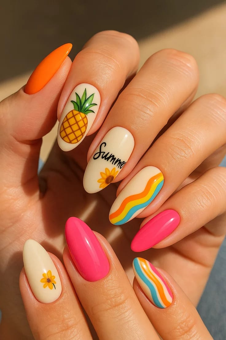 Bright orange and pink nails paired with pineapples, colorful stripes, and a sunflower bring an exciting, tropical feel to this design. It’s cheerful and perfect for sunny days.
