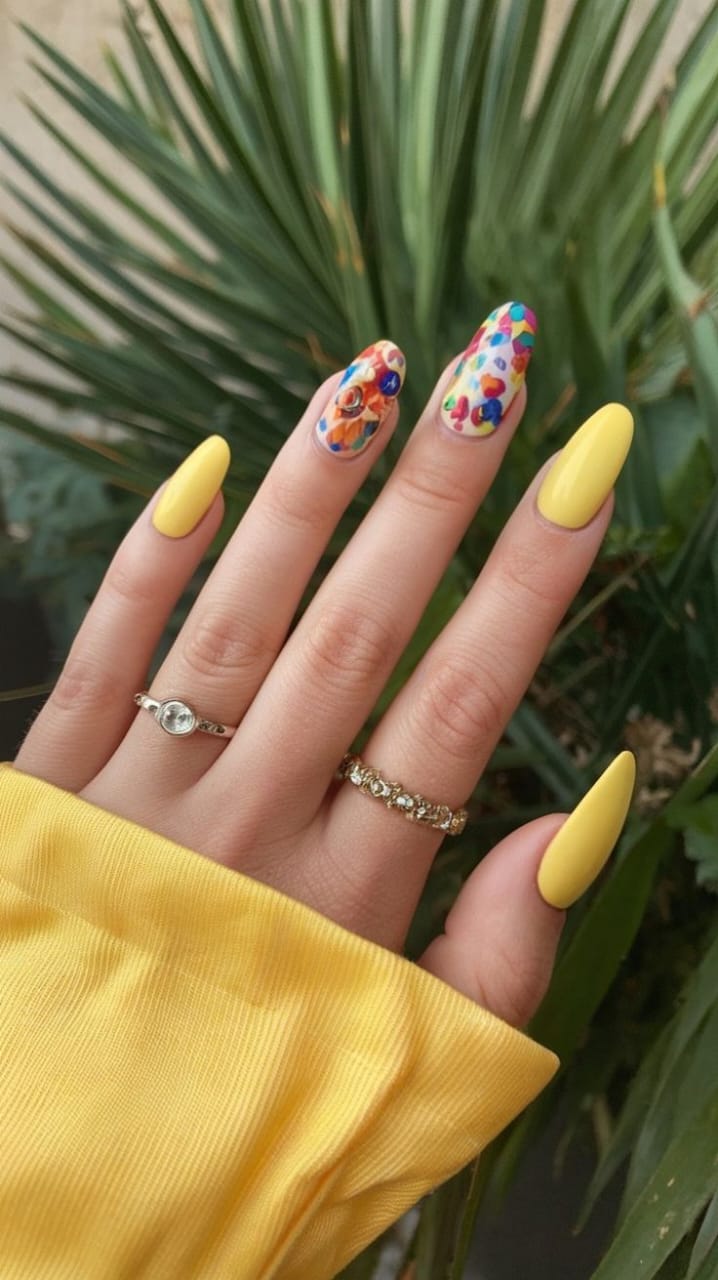 Yellow nails with playful, colorful abstract designs offer a cheerful and lively vibe. It’s a bold, modern take on summer with vibrant patterns that pop.
