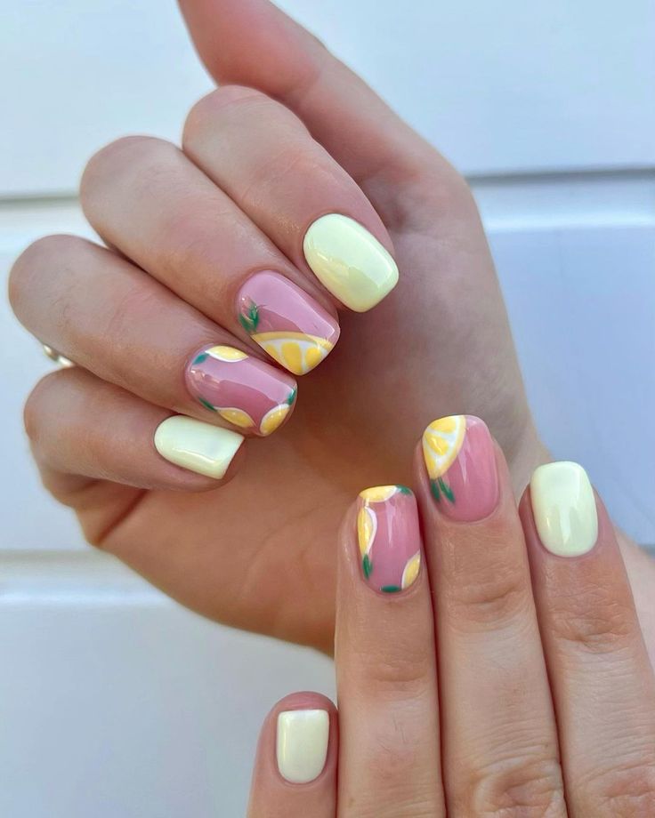 A light pink and yellow combination with lemon slice accents gives this design a fresh, fruity look. It’s a summery, refreshing style perfect for a laid-back vibe.
