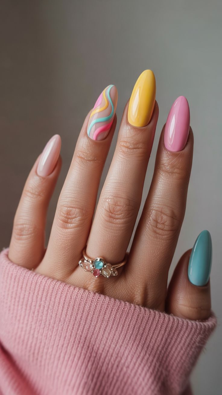 This design features pastel shades with a fun swirl pattern in pink, yellow, and blue, giving it a playful, candy-inspired look. The glossy finish adds a vibrant touch to the overall style.
