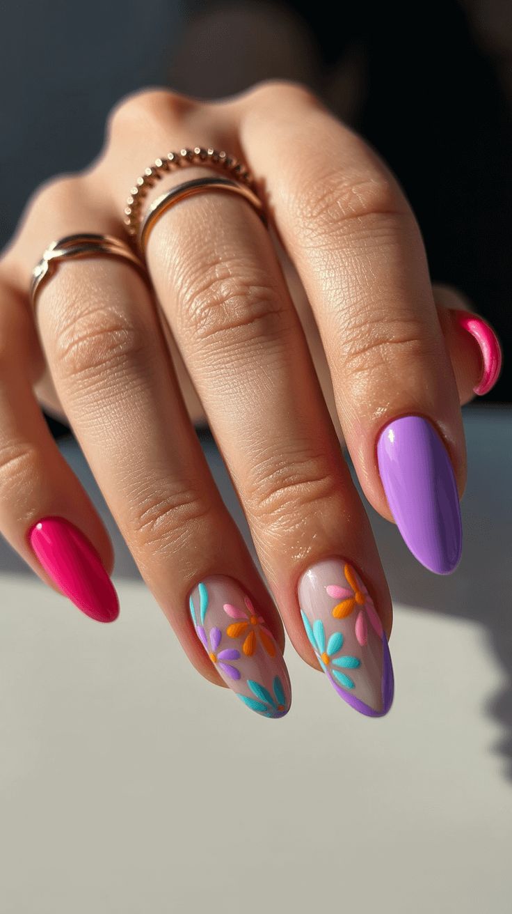 A soft, feminine design with a mix of bright purple, pink, and orange flowers over a light, nude base. The colorful blooms bring a cheerful, summery vibe.