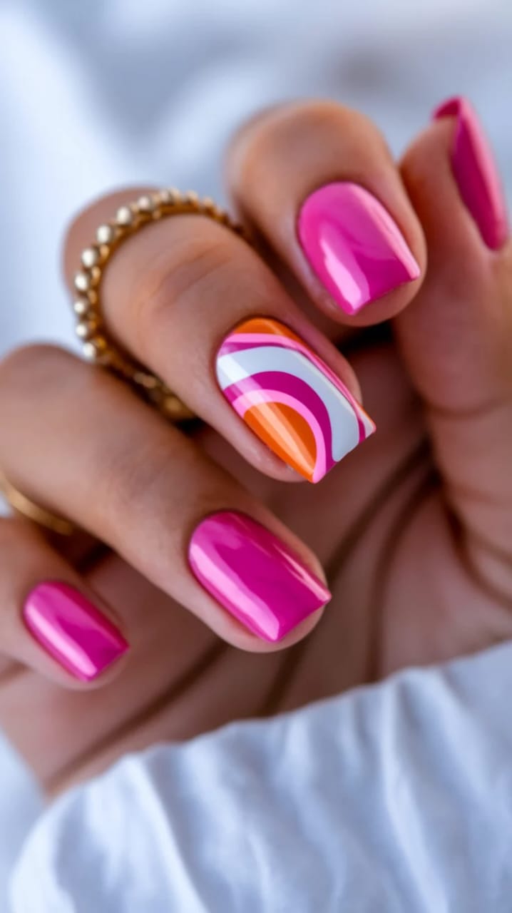 Bold pink nails paired with an eye-catching orange and white wave pattern create a retro-inspired, vibrant look. The clean lines and glossy finish bring a modern twist to the 70s style.