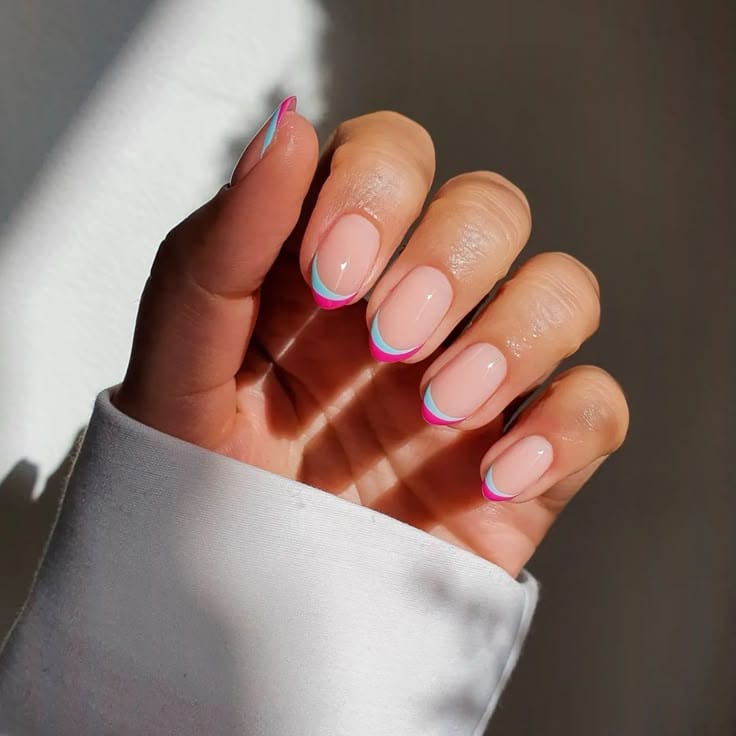 This design features a fun and vibrant mix of pastel French tips in neon shades of pink, blue, yellow, and green. The clean, minimalistic base lets the colorful tips pop, giving a bold and cheerful vibe perfect for summer.