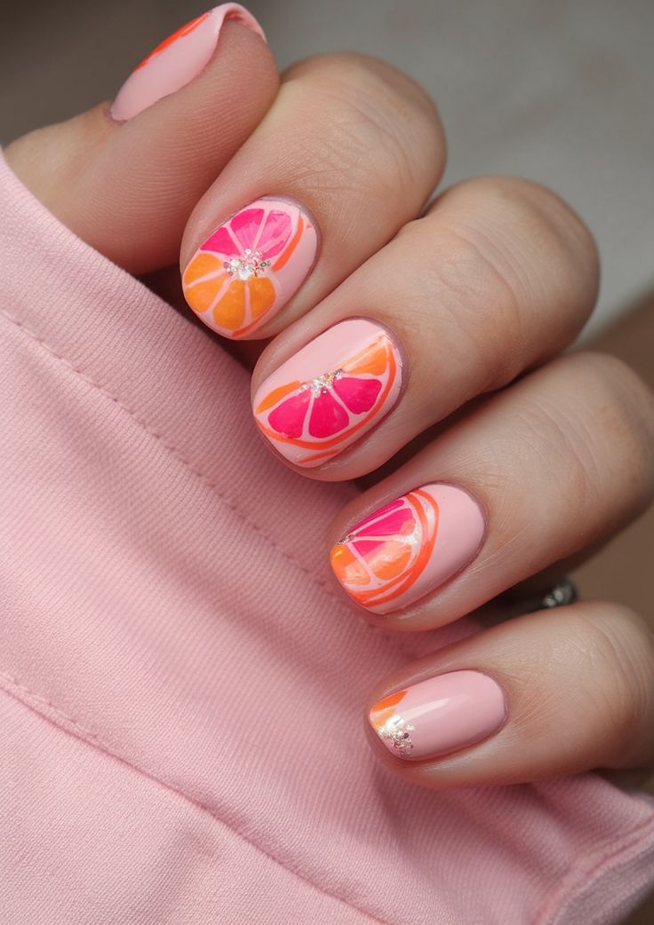 A fresh and fun citrus-inspired design with vibrant orange and pink tones forming a playful geometric pattern, finished with tiny gems for extra sparkle.