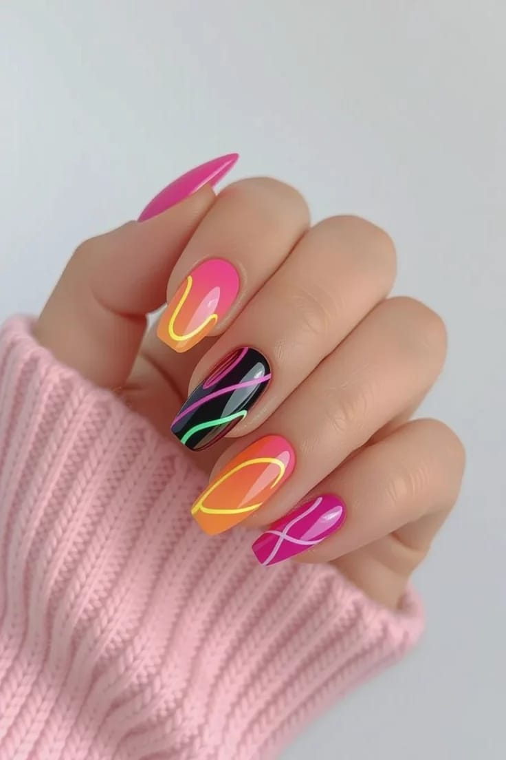 This design features bold neon pink, orange, and yellow swirls on a deep pink base, creating a dynamic and energetic look with a pop of playful color.